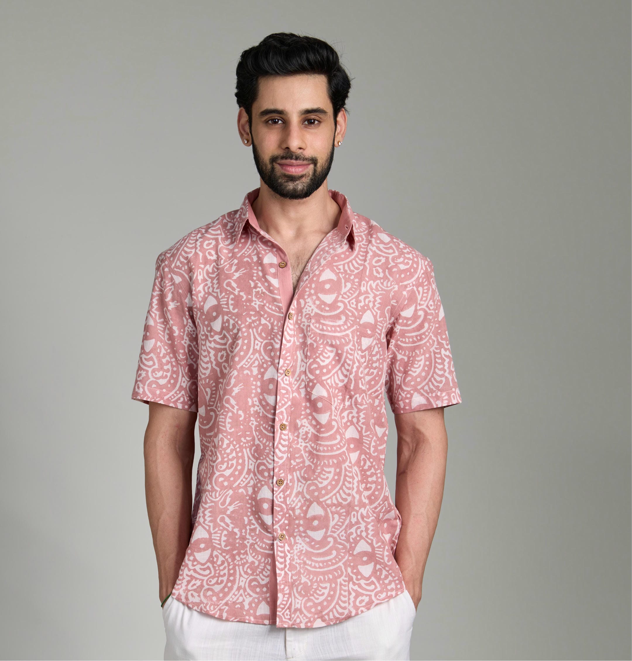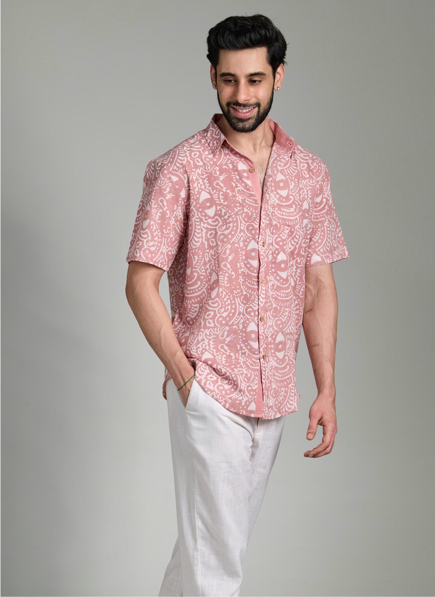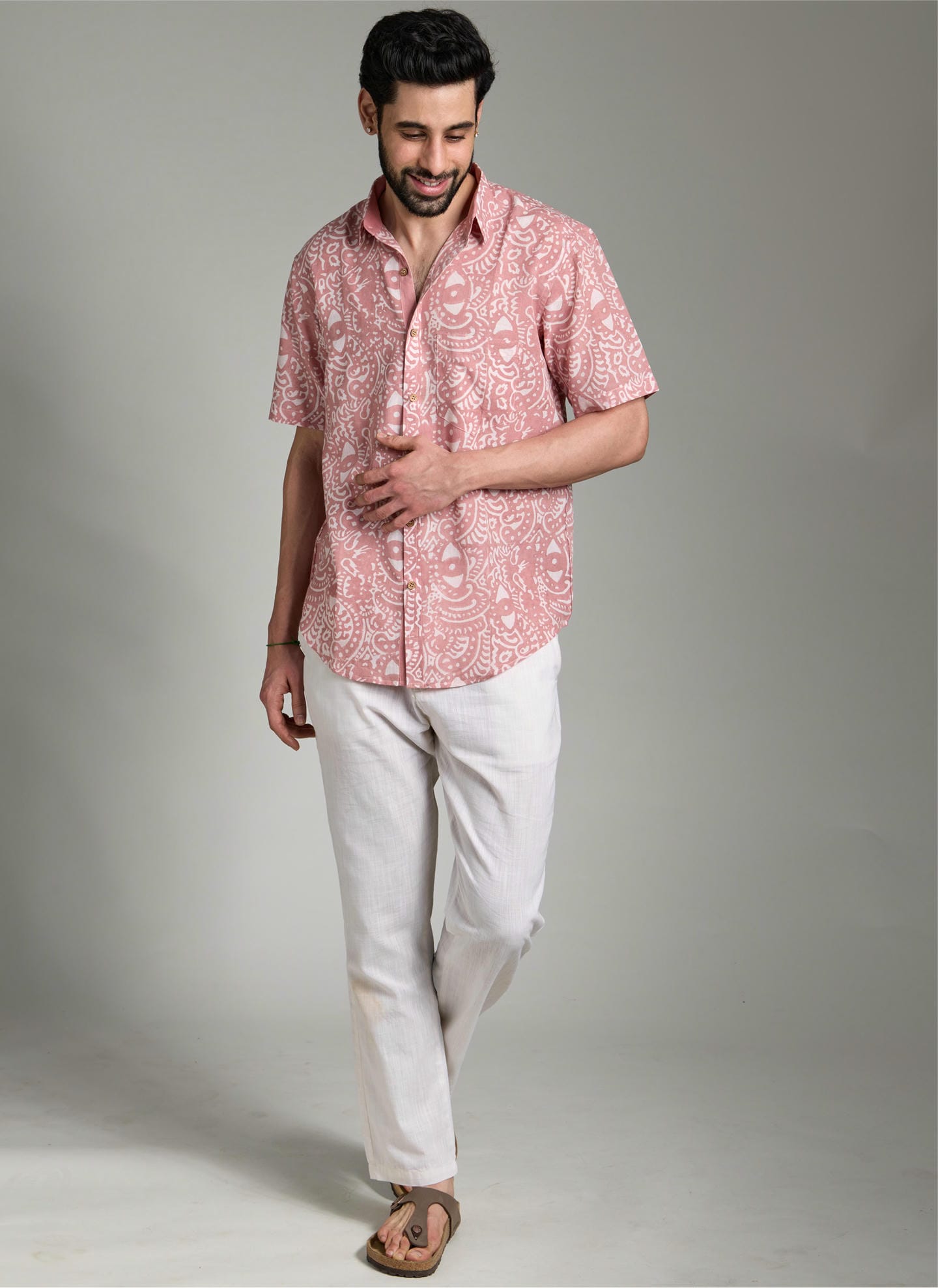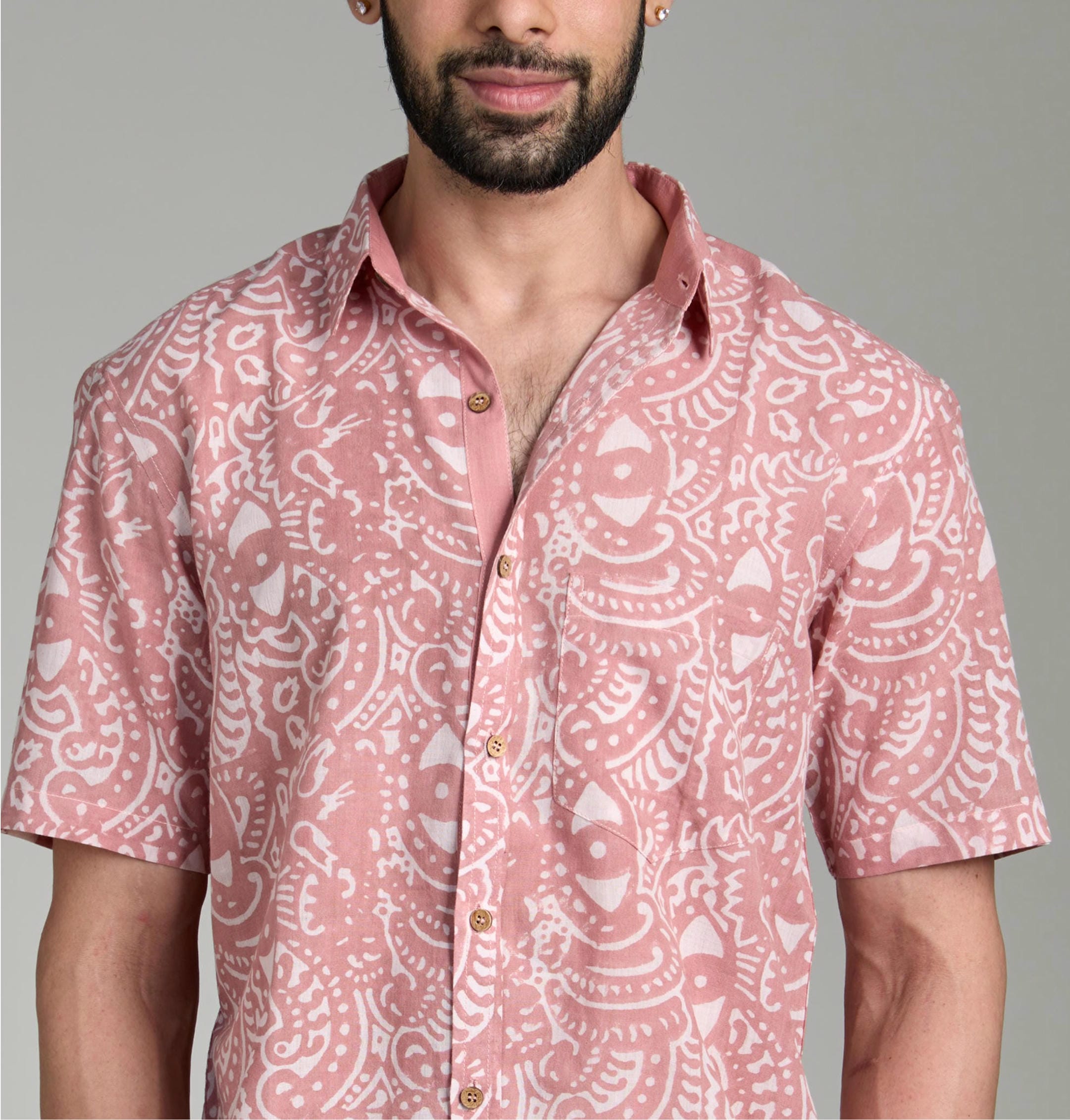 Bold, expressive, and full of character, this shirt features intricate block-printed graphics on handwoven fabric, turning traditional craft into a contemporary statement. The playful patterns bring energy and personality, making it perfect for smart-casual outings, relaxed weekends, or creative gatherings.