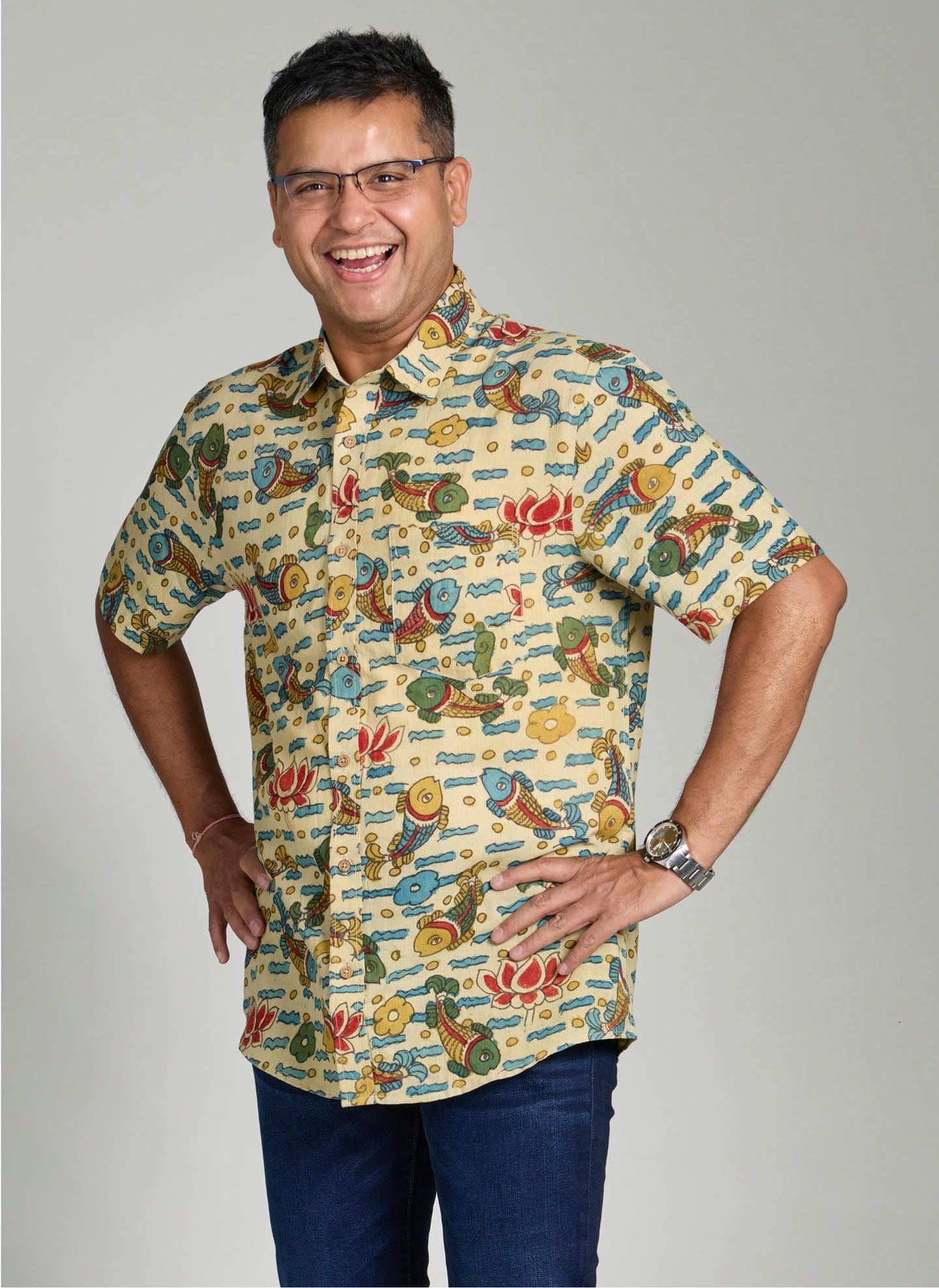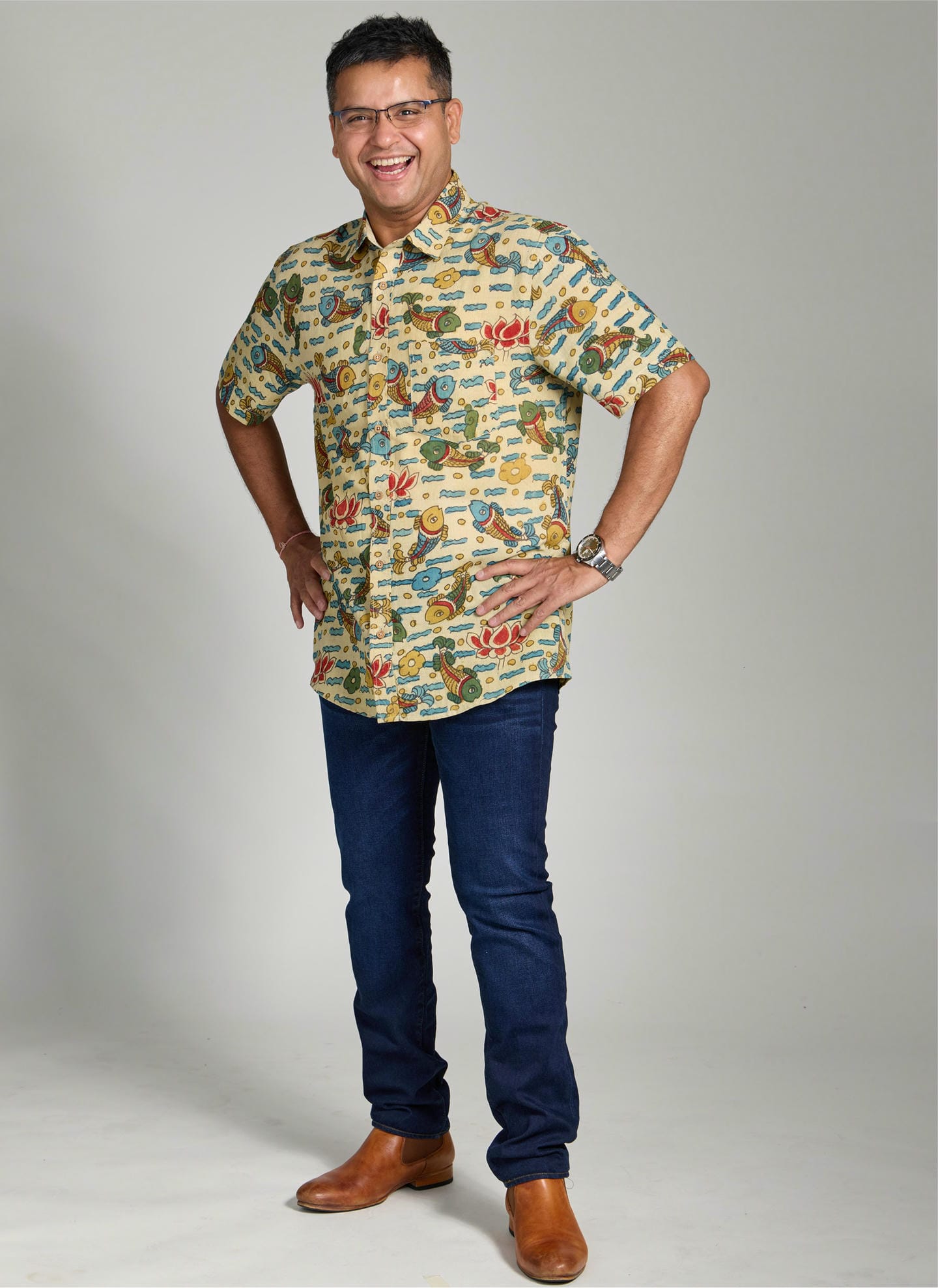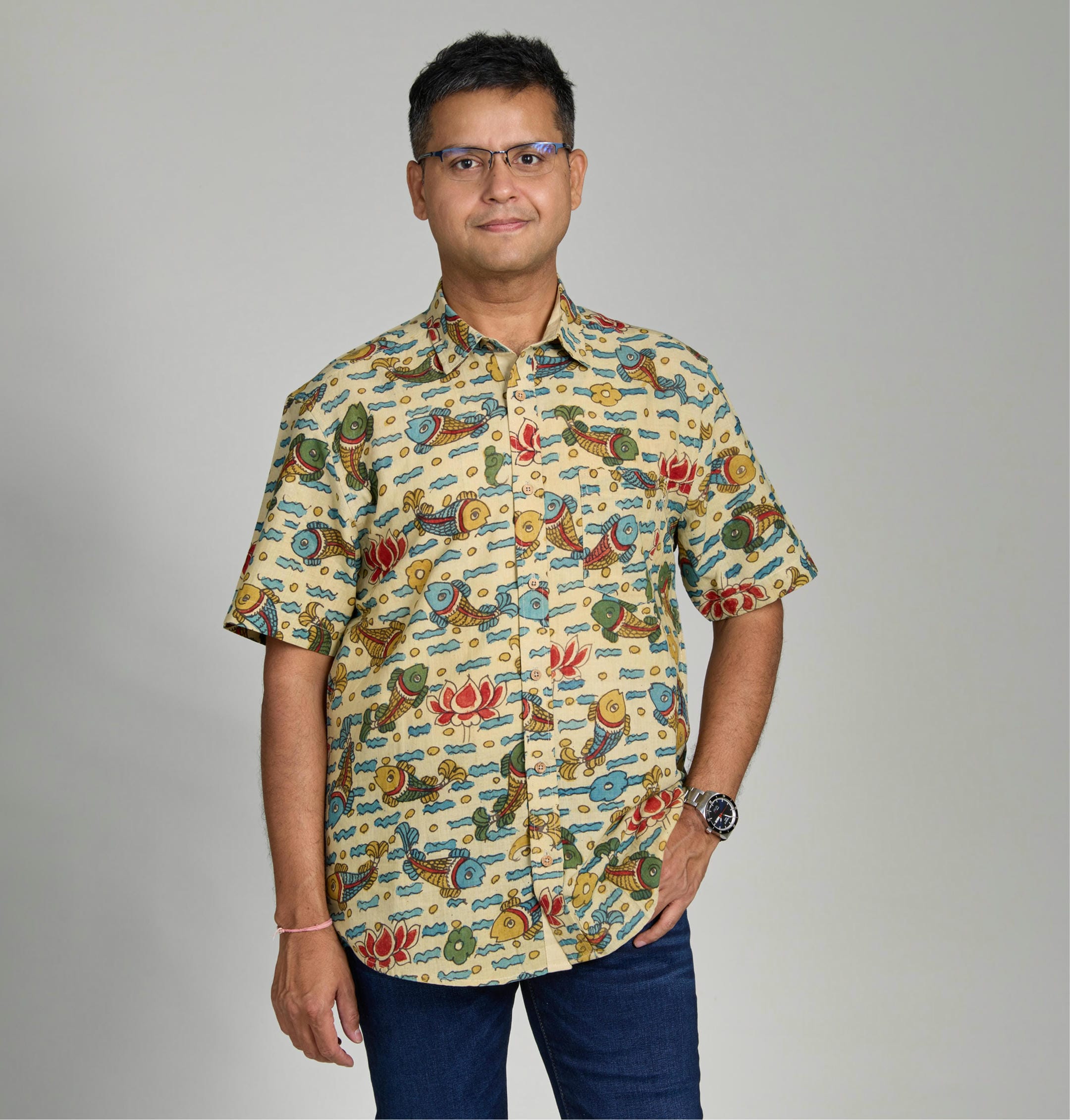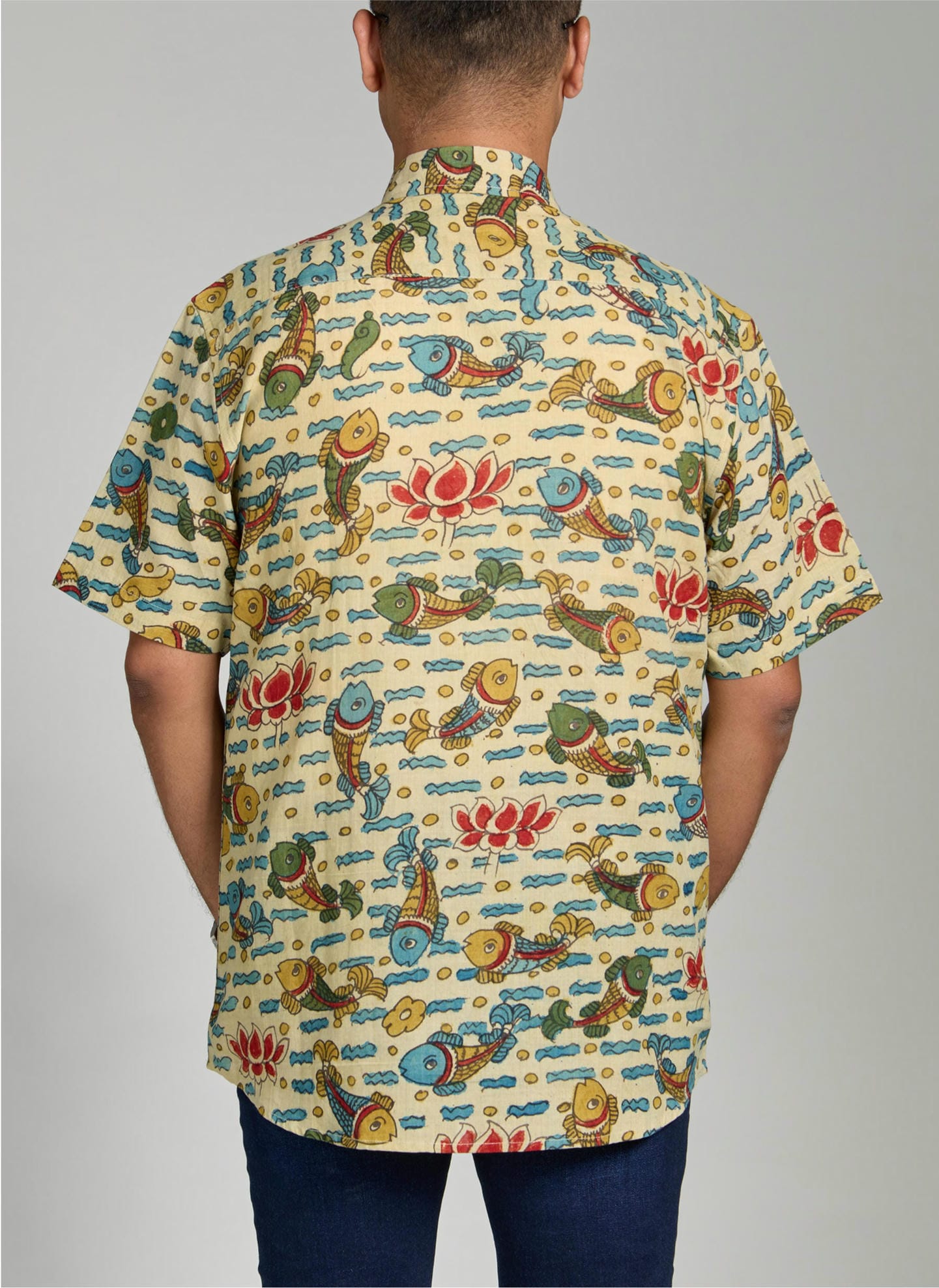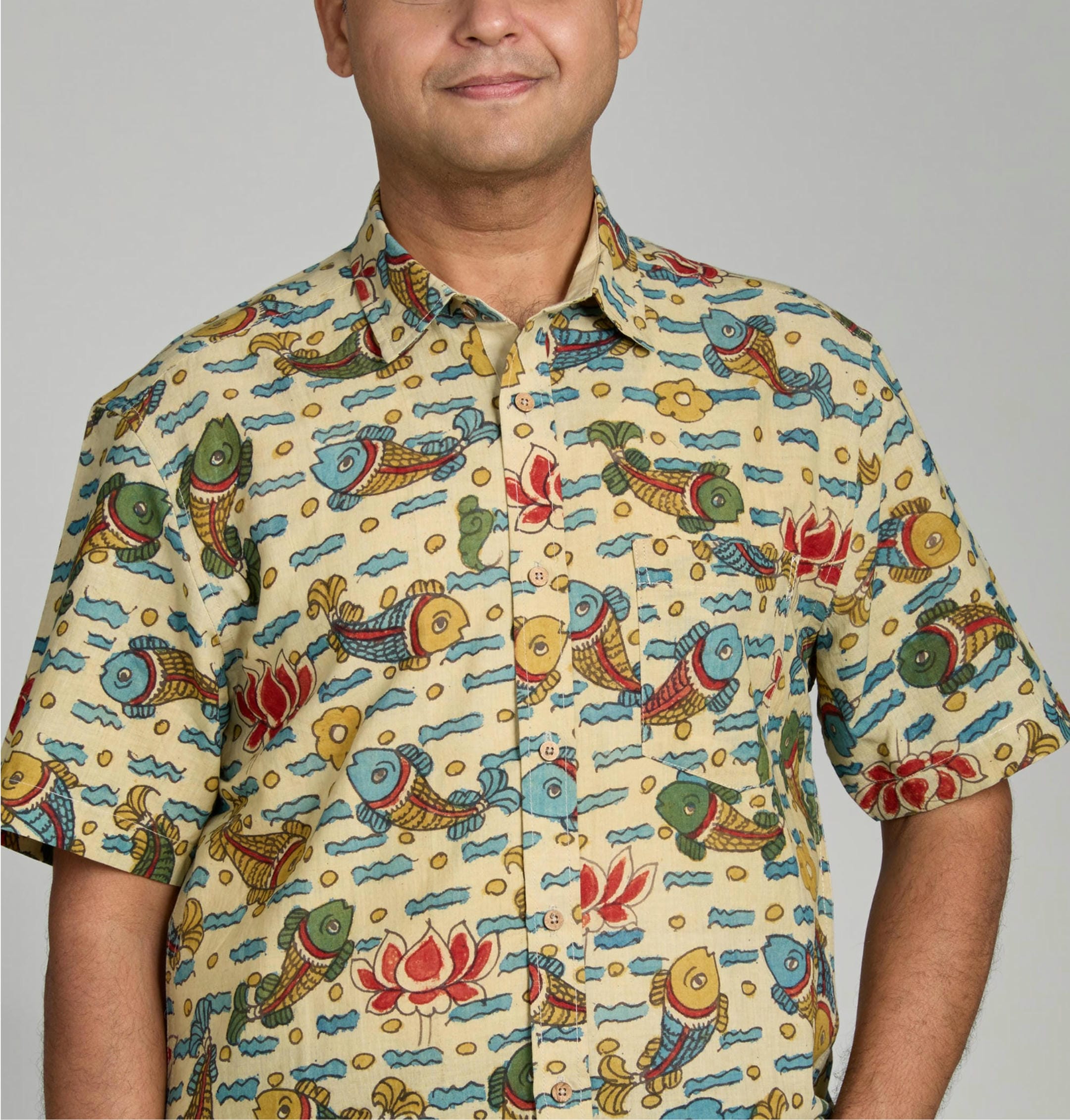 This handwoven shirt is a tribute to the timeless artistry of pen-kalamkari, one of Indiaβs most treasured textile traditions. The fabric carries the subtle earthy aroma and delicate texture of natural dyes, evoking the soul of age-old craftsmanship. Traditional motifs are thoughtfully reimagined for the contemporary man, creating a harmonious blend of heritage and modern elegance.